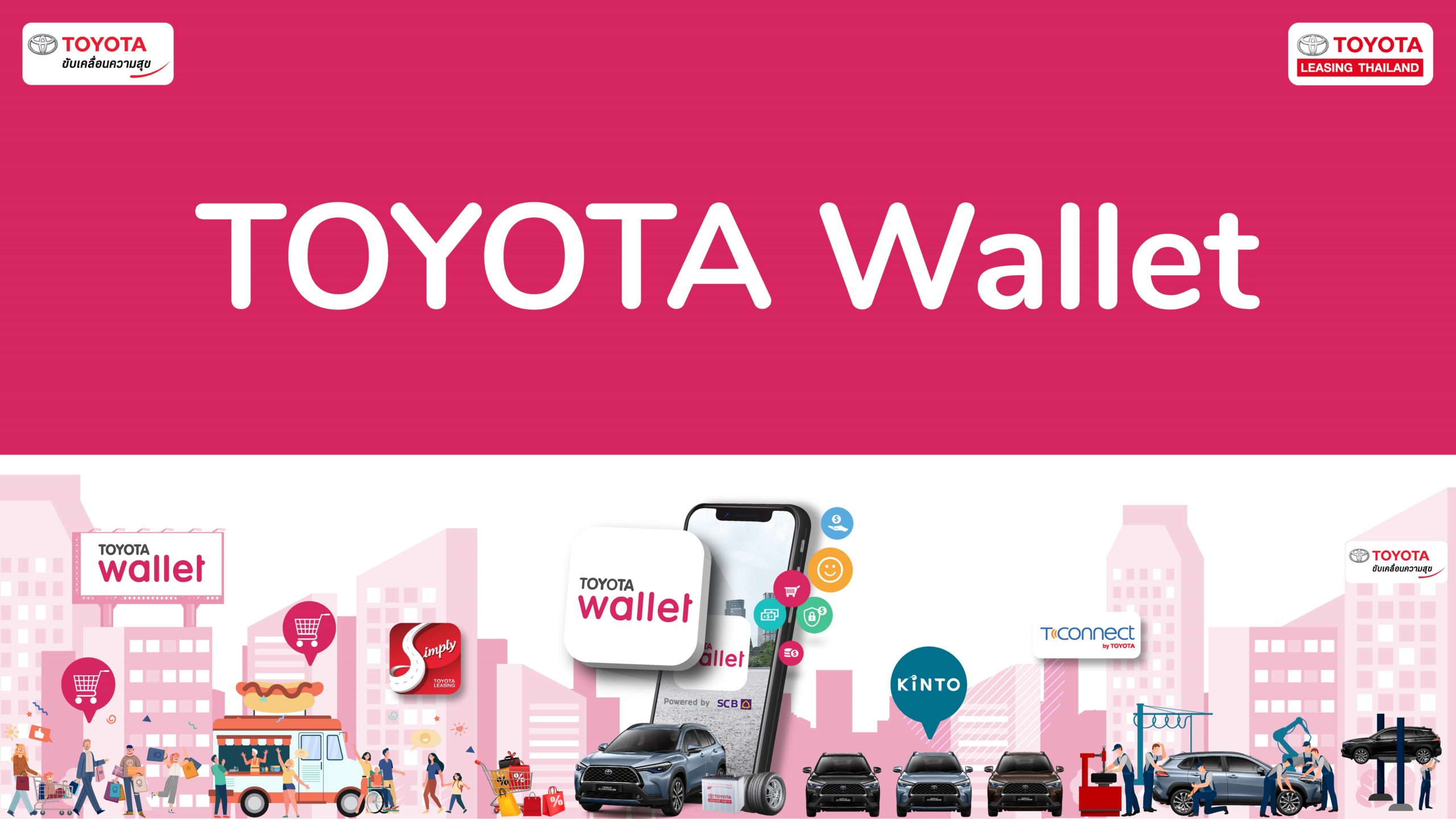 บริษัท โตโยต้า มอเตอร์ ประเทศไทย จำกัด และ บริษัท โตโยต้า ลีสซิ่ง (ประเทศไทย) จำกัด แนะนำ TOYOTA Wallet (โตโยต้า วอลเล็ท) กระเป๋าเงินดิจิทัลจากโตโยต้า ครั้งแรกในประเทศไทย ซึ่งถือเป็นความร่วมมือที่จะตอบโจทย์ลูกค้าในประเทศไทยภายใต้รูปแบบวิถีใหม่ (New Normal) ให้อิสระแห่งการใช้จ่ายสำหรับสังคมแห่งการขับเคลื่อน ด้วยความมุ่งมั่นในการพัฒนานวัตกรรมทางเทคโนโลยีผ่านแอปพลิเคชันแพลตฟอร์ม ในรูปแบบกระเป๋าเงินดิจิทัล (e-Wallet) ที่สามารถตอบสนองความต้องการของลูกค้าภายใต้สังคมไร้เงินสดอย่างสมบูรณ์แบบ ให้ความสะดวกสบาย และปลอดภัยในทุกการใช้จ่าย โดยลูกค้าสามารถใช้ TOYOTA Wallet กระเป๋าเงินดิจิทัล ที่ใช้งานง่าย ใช้ได้ทุกที่ทุกเวลา ทั้งในร้านค้าทั่วไปและร้านค้าออนไลน์ พร้อมทั้งยังสามารถเชื่อมต่อบัตรเครดิตและบัตรเดบิตเพื่อเติมเงิน โดยลูกค้าสามารถใช้จ่ายผ่าน TOYOTA Wallet เพียงมีบัญชีธนาคารไทยพาณิชย์และแอปพลิเคชัน SCB Easy ได้แล้ววันนี้