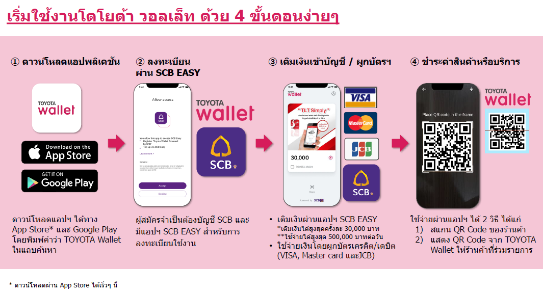 ลูกค้าผู้สนใจสามารถดาวน์โหลดแอปพลิเคชัน Toyota Wallet ได้จากระบบปฏิบัติการ Android ในช่วงเปิดตัว และจะขยายไปสู่ระบบปฏิบัติการ iOS เร็วๆนี้ โดยลูกค้าจะต้องมีบัญชีธนาคารไทยพาณิชย์และแอปพลิเคชัน SCB Easy เพียงลูกค้าลงทะเบียนครั้งแรกจะได้สิทธิพิเศษบัตรกำนัล Starbucks มูลค่า 100 บาท และส่วนลดค่าบริการหลังการขาย มูลค่า 100 บาท เมื่อชำระค่าบริการภายใต้เงื่อนไขที่กำหนดที่ศูนย์บริการโตโยต้าที่เข้าร่วมโครงการฯ โดยภายในปี 2563 Toyota Wallet สามารถให้บริการเพื่อใช้จ่ายภายในศูนย์บริการโตโยต้าของผู้แทนจำหน่ายโตโยต้าในเขตกรุงเทพฯ และปริมณฑล และมีแผนที่จะขยายให้ครอบคลุมผู้แทนจำหน่ายโตโยต้าทั่วประเทศภายในปี 2564 รวมถึงร้านค้าจากเครือข่ายพันธมิตรทางธุรกิจ