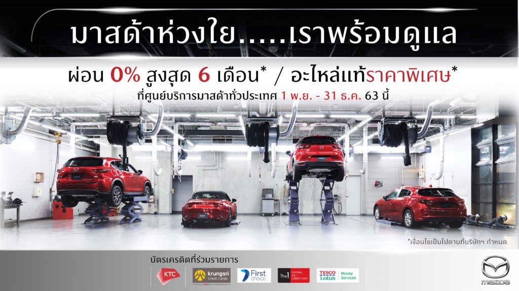 ทั้งนี้ มาสด้าขอขอบคุณลูกค้าทุกท่านที่ให้การสนับสนุนและไว้วางใจในผลิตภัณฑ์ของมาสด้าเป็นอย่างดี โดยเฉพาะการตอบรับรถตระกูล CX-Series จนทำให้ยอดขายเพิ่มขึ้นอย่างถล่มทลาย ในโอกาสพิเศษนี้มาสด้าได้มอบแคมเปญพิเศษเพื่อเอาใจคนรัก CX-Series ด้วยดอกเบี้ยต่ำสุด 0%, ฟรีประกันภัยชั้นหนึ่ง Mazda Premium Insurance, ขยายการรับประกันคุณภาพสูงสุด 5 ปี หรือ 150,000 กม. และฟรีค่าแรงเช็คระยะนาน 5 ปี หรือ 100,000 กม. ทั้งนี้ เพื่อเป็นการสนับสนุนมาตรการกระตุ้นเศรษฐกิจจากภาครัฐตามโครงการ “ช๊อปดีมีคืน” มาสด้ายินดีมอบโปรโมชั่นสุดพิเศษกับโครงการ Mazda Always Care เพราะห่วงใย…เราพร้อมดูแล เพียงนำรถเข้าเช็คเตรียมความพร้อมกับการใช้ชีวิตรูปแบบใหม่ มาสด้าบริการตรวจเช็คฟรี 20 รายการ อะไหล่แท้ราคาพิเศษ แบตเตอรี่ราคาเริ่มต้นเพียง 2,200 บาท ยางราคาเริ่มต้นเพียงเส้นละ 2,200 บาท สามารถผ่อน 0% นานสูงสุด 6 เดือน เริ่มตั้งแต่วันนี้จนถึง 31 ธันวาคม 2563 นี้* ลูกค้าที่สนใจสามารถสอบถามได้ที่โชว์รูมมาสด้าทั่วประเทศ