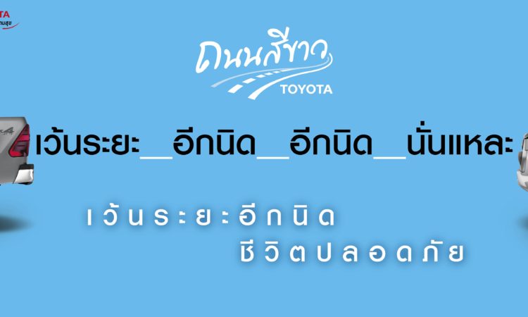 โตโยต้าขอเชิญชวนทุกท่านมามีส่วนร่วมในการรณรงค์และประชาสัมพันธ์ การเว้นระยะห่างในการขับขี่ “เว้นระยะอีกนิด ชีวิตปลอดภัย” ให้ทุกคนเดินทางอย่างปลอดภัยในช่วงวันหยุด เพื่อขับเคลื่อนความสุขและส่งมอบรอยยิ้มให้แก่คนไทยทุกคน