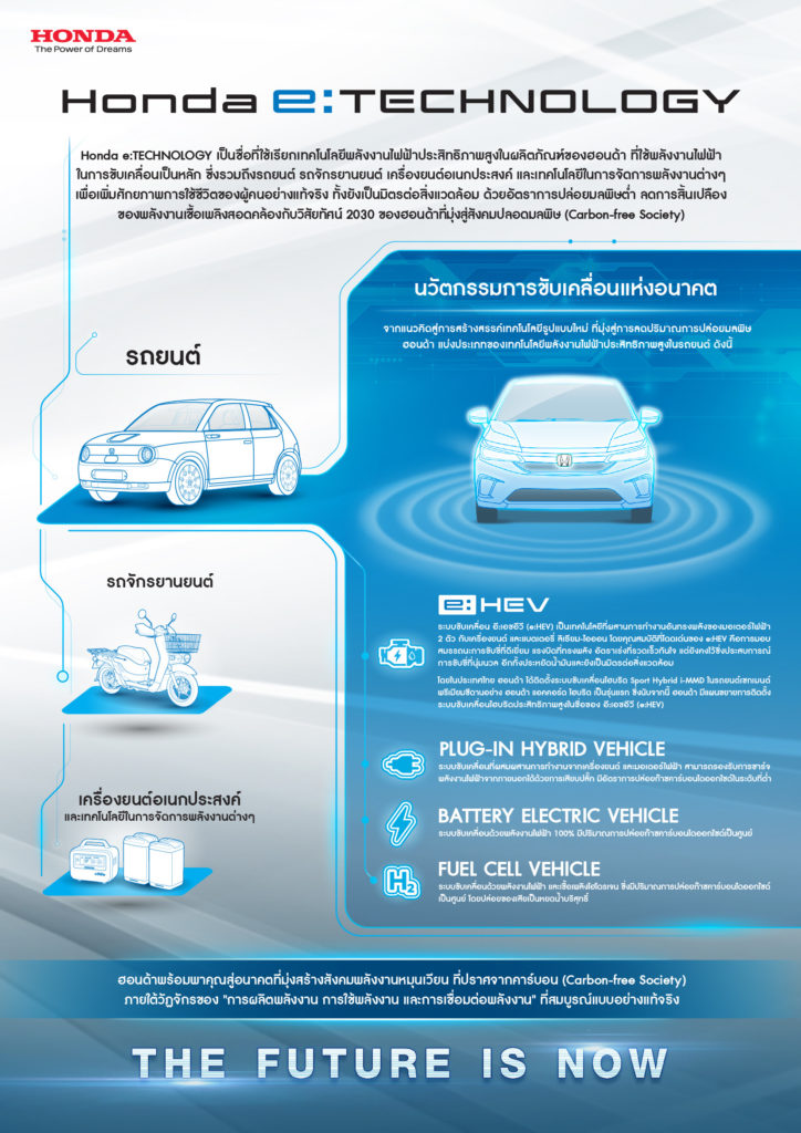 ฮอนด้า แบรนด์ผู้ผลิตรถยนต์ชั้นนำ ให้ความสำคัญกับการพัฒนาและนำเสนอคุณค่าใหม่แห่งยนตรกรรมอย่างไม่หยุดนิ่ง ทั้งในด้านเทคโนโลยีการขับเคลื่อนและเทคโนโลยีความปลอดภัย เพื่อมอบประสบการณ์การเดินทางรูปแบบใหม่ที่ตอบโจทย์กับไลฟ์สไตล์ของผู้คนที่เปลี่ยนแปลงไปในปัจจุบันตอบรับกับวิสัยทัศน์ 2030 ของฮอนด้าที่มุ่งเน้นด้านการส่งมอบความสุขและเพิ่มศักยภาพในการใช้ชีวิตโดยมีเป้าหมายภายใต้2 ทิศทางหลักได้แก่ ด้านสิ่งแวดล้อมเพื่อก้าวไปสู่สังคมปลอดมลพิษ (Carbon-free Society) และด้านความปลอดภัย เพื่อก้าวไปสู่สังคมปลอดอุบัติเหตุ (Collision-free Society)นับเป็นความท้าทายและแรงกระตุ้นของฮอนด้า ในการพัฒนาการขับเคลื่อนด้วยพลังงานไฟฟ้า เพื่อที่จะบรรลุเป้าหมายได้อย่างแท้จริง ฮอนด้าได้มุ่งมั่นพัฒนาเทคโนโลยีการขับเคลื่อนที่มอบสมรรถนะการขับขี่ที่ทรงพลัง แต่ยังเป็นมิตรต่อสิ่งแวดล้อมด้วยอัตราการปล่อยมลพิษที่ต่ำ ลดการสิ้นเปลืองของพลังงาน และนับจากนี้ ฮอนด้าพร้อมที่จะสื่อสารถึงเทคโนโลยีพลังงานไฟฟ้าประสิทธิภาพสูงอย่างเป็นทางการภายใต้ชื่อe:TECHNOLOGY