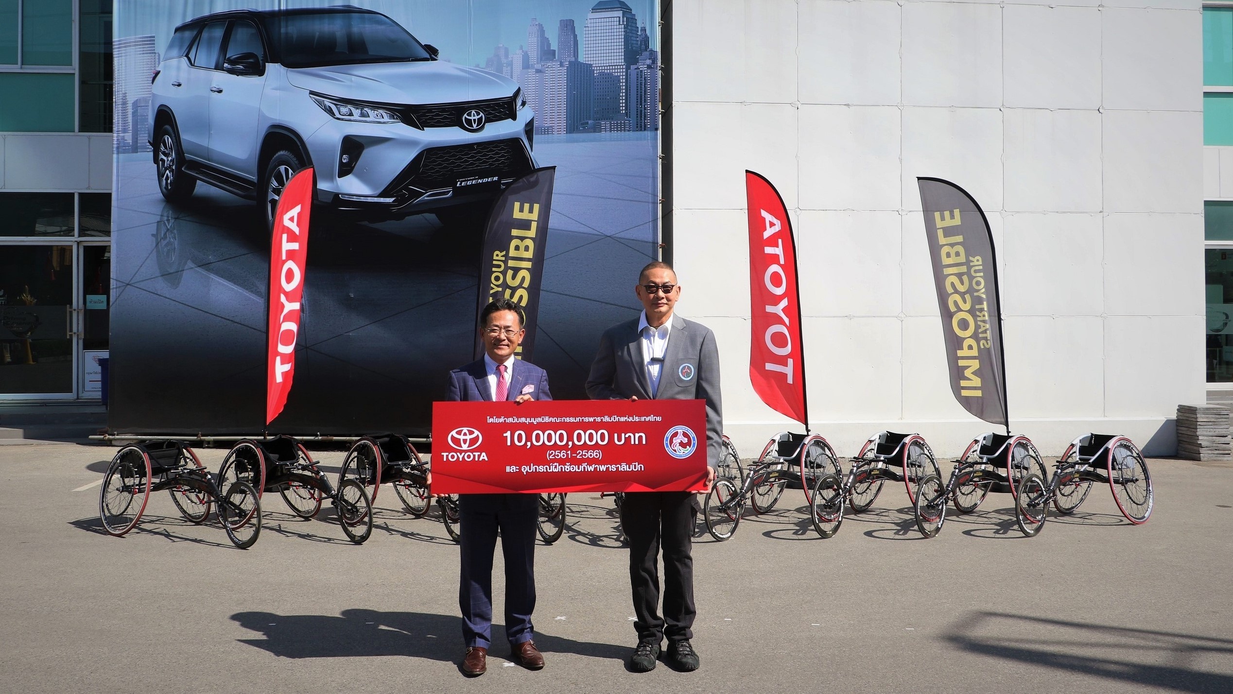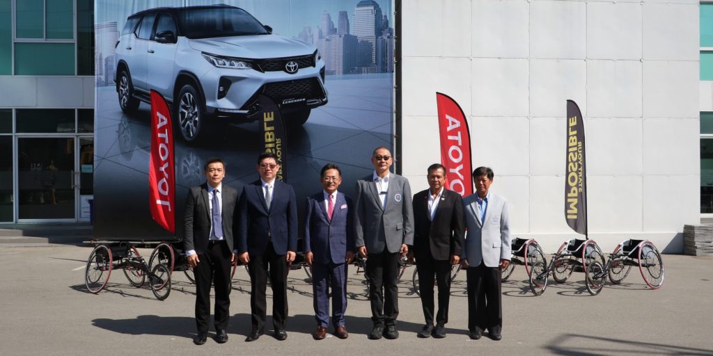 นายมิจิโนบุ ซึงาตะ กรรมการผู้จัดการใหญ่ พร้อมด้วย นายสุรศักดิ์ สุทองวัน รองกรรมการผู้จัดการใหญ่และนายศุภชัย สินสุวรรณรักษ์ ผู้ช่วยกรรมการผู้จัดการใหญ่ บริษัท โตโยต้ามอเตอร์ ประเทศไทย จำกัด ร่วมพิธีส่งมอบการสนับสนุนเรซซิ่ง วีลแชร์ จำนวน 10 คันพร้อมเงินสนับสนุนจำนวน 10 ล้านบาทและชุดเครื่องแบบกีฬาสำหรับนักกีฬาพาราลิมปิก ให้แก่นายจุตินันท์ภิรมย์ภักดีประธานคณะกรรมการพาราลิมปิกแห่งประเทศไทยดร.กิตติพงษ์ โพธิมู กรรมการมูลนิธิพาราลิมปิกแห่งประเทศไทยนายพิทักษ์ พลขันธ์ กรรมการฝ่ายเทคนิคกีฬา คณะกรรมการพาราลิมปิกแห่งประเทศไทยเพื่อสนับสนุนในการฝึกซ้อมรวมถึงพัฒนาศักยภาพนักกีฬาพาราลิมปิกทีมชาติไทย เมื่อวันที่18พฤศจิกายน 2563 ณศูนย์ทดสอบรถยนต์โตโยต้าTOYOTA Driving Experience Park บางนากม.3
