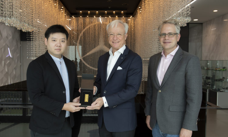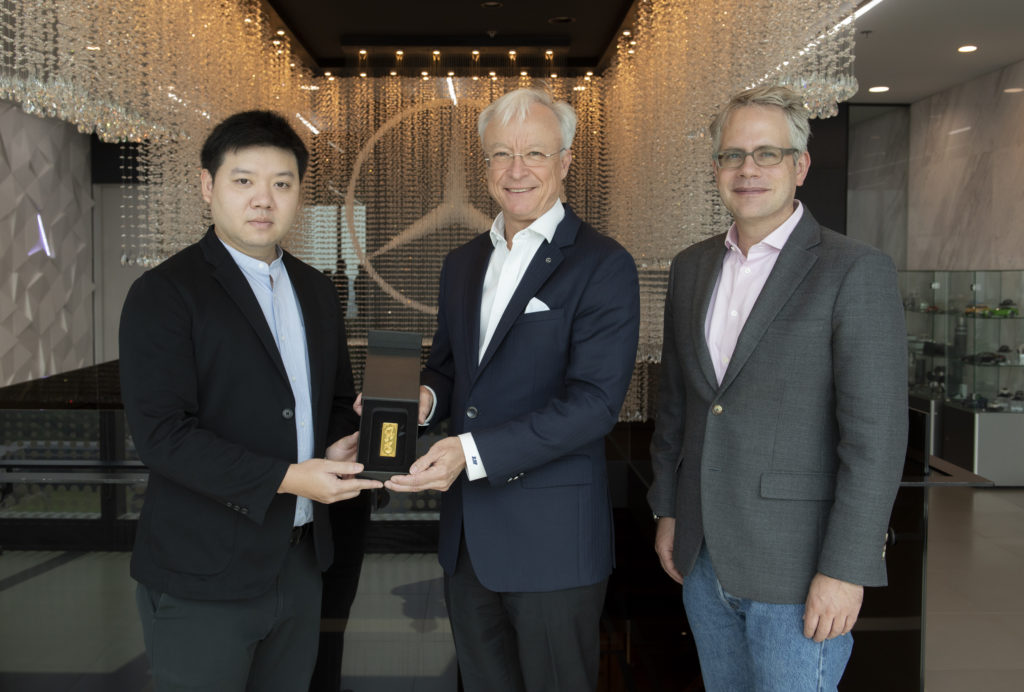 นายโรลันด์ โฟล์เกอร์ (กลาง) ประธานบริหาร บริษัท เมอร์เซเดส-เบนซ์ (ประเทศไทย) จำกัด มอบทองคำ96.5% น้ำหนักรวม38 บาท มูลค่ากว่า 1ล้านบาทให้กับคุณอำนาจ ตั้งจิตมุ่งมั่น ลูกค้าที่ซื้อรถยนต์ “Mercedes-Benz GLB 200 Progressive” กับบริษัท ที เอส ที หัวหิน จำกัด ผู้จำหน่ายเมอร์เซเดส-เบนซ์ อย่างเป็นทางการผ่านช่องทางออนไลน์ในแคมเปญพิเศษของ The new GLB ระหว่างวันที่ 15 กรกฎาคมถึง 30กันยายน2563 ที่ผ่านมา โดยมีมร. บีเยิร์น กุซเทรา (ขวา) รองประธานบริหารฝ่ายขายและการตลาด ร่วมแสดงความยินดี ที่สำนักงานใหญ่ของบริษัท เมอร์เซเดส-เบนซ์ (ประเทศไทย) จำกัด