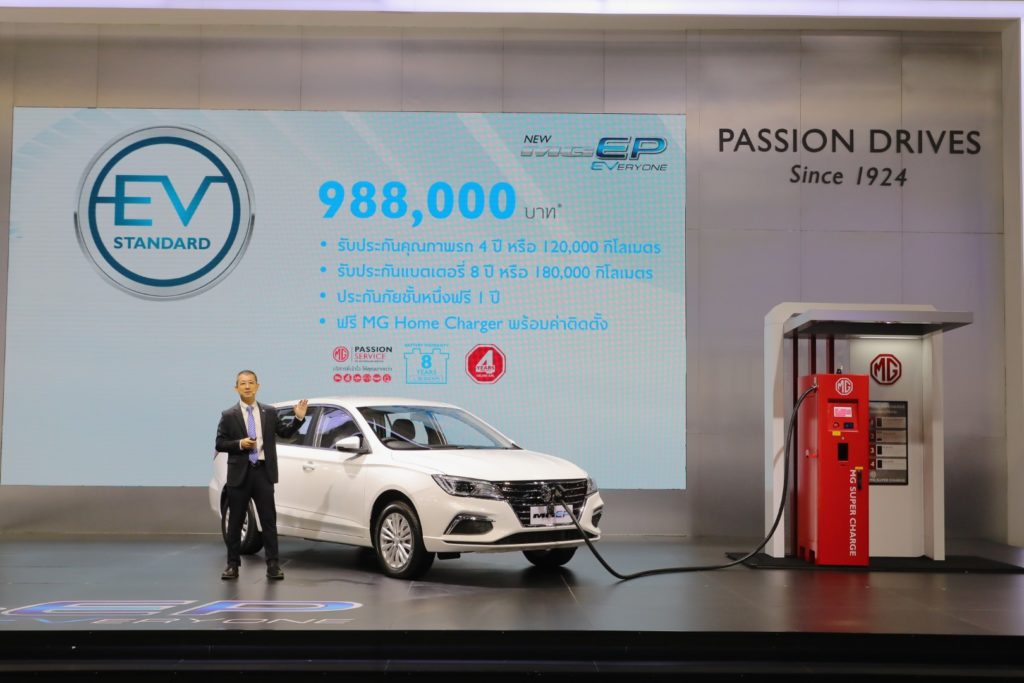 นายพงษ์ศักดิ์ เลิศฤดีวัฒนวงศ์ รองกรรมการผู้จัดการบริษัทเอ็มจีเซลส์ (ประเทศไทย) จำกัด เปิดเผยว่า “เอ็มจีนำเสนอยานยนต์ด้วย3แนวคิดหลักได้แก่ 1) ความทันสมัยหรือแฟชั่น 2) เทคโนโลยีและ 3) ความคุ้มค่าซึ่งทั้ง 3 แนวคิดหลักนี้จะถูกนำมาใช้ตั้งแต่การออกแบบการคิดค้นนวัตกรรมสมรรถนะฟังก์ชั่นการใช้งานและระบบความปลอดภัยสำหรับNEW MG EPจะเป็นมาตรฐานขั้นต้นของรถยนต์พลังงานไฟฟ้า100% หรือEntry EV ของตลาดรถยนต์เมืองไทยนับจากนี้ด้วยจุดเด่นของการเป็น EV For Everyoneที่สามารถตอบโจทย์การใช้งานของลูกค้าได้ทุกรูปแบบทั้งขนาดของห้องโดยสารที่กว้างขวาง รวมถึงพื้นที่ใช้สอยที่สะดวกสบาย ความจุในการบรรทุกสัมภาระที่เหนือกว่า สมรรถนะของเทคโนโลยีของรถยนต์ไฟฟ้า100% ระบบความปลอดภัยครบครัน และความคุ้มค่าในการเป็นเจ้าของ ในราคา 988,000 บาท ยิ่งไปกว่านั้นขณะนี้ สถานีอัดประจุไฟฟ้าของเอ็มจีภายใต้ชื่อ MG SuperCharge ได้ติดตั้งที่ดีลเลอร์เอ็มจีครบ100 แห่ง และอยู่ในระหว่างทดลองระบบซึ่งคาดว่าจะสามารถใช้ได้จริงในเดือนมกราคมนี้ นอกจากนี้เรายังมีแผนจะขยายจุดให้บริการ MG Super Charge อีกกว่า 500 แห่งภายในปีหน้า ซึ่งบริษัทฯ เชื่อมั่นว่ารถยนต์ไฟฟ้าของเอ็มจีจะสามารถใช้งานได้จริงในทุกพื้นที่ทั่วประเทศในเวลาอันใกล้นี้”