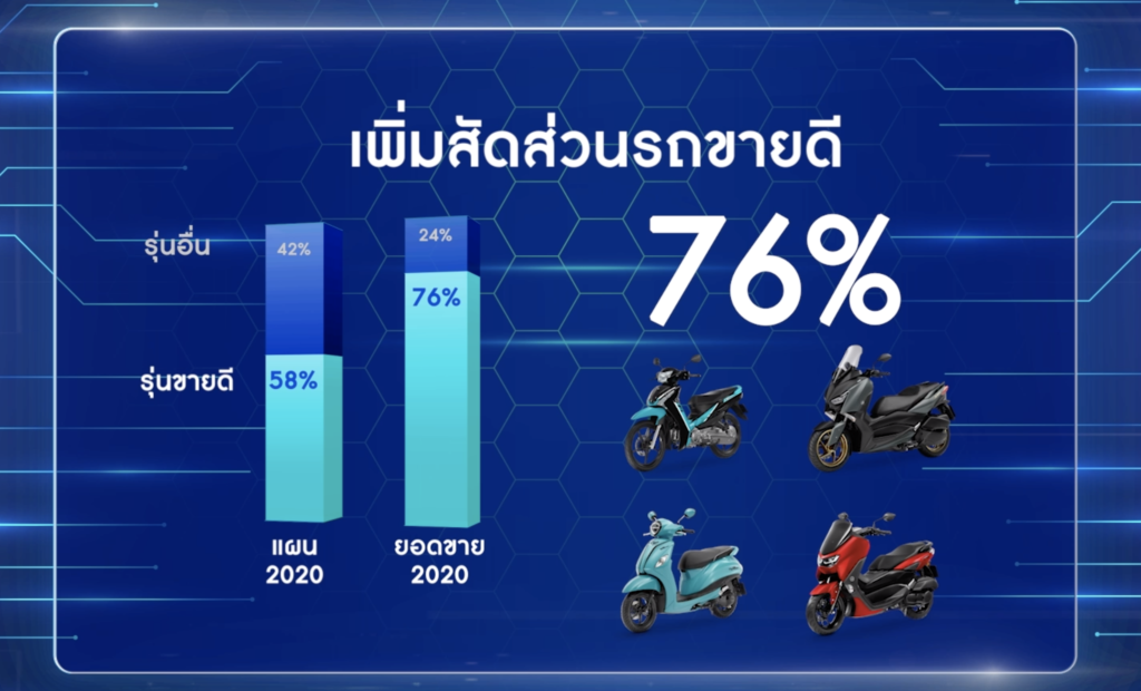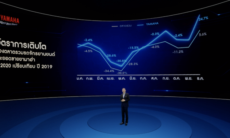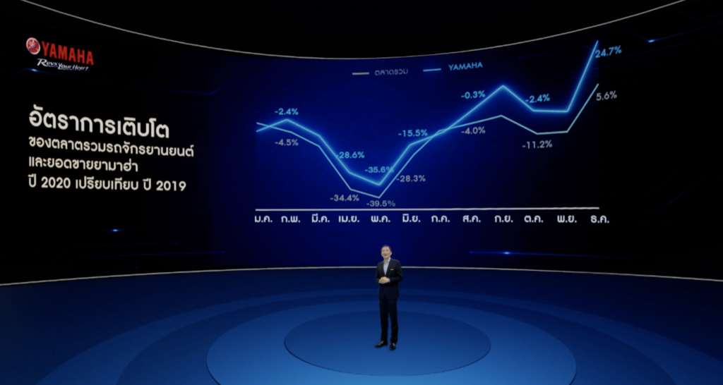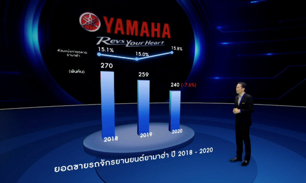 นายเท็ตสึยะ โนซากิ ประธานกรรมการบริหาร บริษัท ไทยยามาฮ่ามอเตอร์ จำกัด กล่าวถึงความสำเร็จของยามาฮ่าในปีที่ผ่านมาว่า“จากการแพร่ระบาดของเชื้อโคโรน่าไวรัส 2019 ในปีที่ผ่านมาเป็นปัจจัยสำคัญที่ทำให้ภาพรวมของตลาดรถจักรยานยนต์ มียอดจดทะเบียนปิดตัวเลขอยู่ที่ 1.52 ล้านคัน ลดลงจากปีก่อนหน้า 12% โดยเป็นตัวเลขของรถจักรยานยนต์ยามาฮ่าทั้งสิ้น 240,000 คัน ลดลง 7.6% เมื่อเทียบกับปีก่อนหน้า ซึ่งเป็นอัตราเติบโตที่เหนือกว่าภาพรวมของตลาดทั้งยังสามารถขยับมาร์เก็ตแชร์เพิ่มขึ้นเป็น15.8% ซึ่งเป็นการเติบโตขึ้นในทุกเซ็กเมนต์ของยามาฮ่าเป็นผลจากการเดินหน้านโยบายด้านการขายและการทำตลาดอย่างเข้มข้นนั่นเอง”