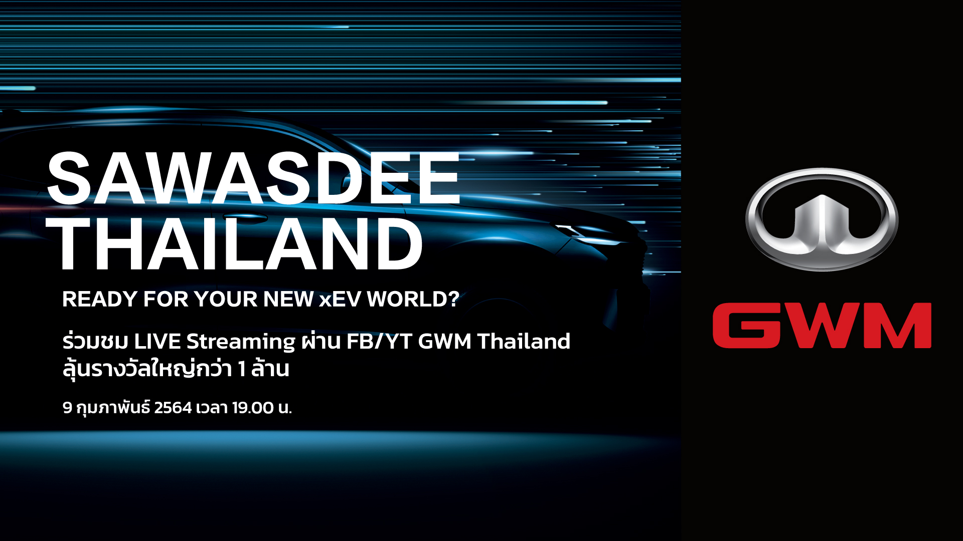เกรท วอลล์ มอเตอร์บริษัทที่ให้บริการการขับเคลื่อนด้วยเทคโนโลยีระดับโลก (Global Mobility Technology Company)จัดLivestreaming แถลงข่าวเปิดตัวแบรนด์อย่างเป็นทางการครั้งแรกในเมืองไทย ภายใต้แนวคิด “Sawasdee Thailand – Experience Your New xEV World”ผ่านทาง Facebook และ YouTube GWM Thailand วันอังคารที่ 9 กุมภาพันธ์นี้ตั้งแต่เวลา 19.00 น. เป็นต้นไปพบกับทีมผู้บริหารนำโดย มร. เอลเลียต จาง ประธาน เกรท วอลล์ มอเตอร์ ภูมิภาคอาเซียนและประเทศไทย, มร.สตีเว่น หวัง รองประธาน ฝ่ายขายและการตลาด เกรท วอลล์ มอเตอร์ ภูมิภาคอาเซียนและประเทศไทยและคุณณรงค์ สีตลายน กรรมการผู้จัดการ เกรท วอลล์ มอเตอร์ ประเทศไทย ที่จะมาร่วมเผยความสำเร็จจากการทำตลาดของเกรท วอลล์ มอเตอร์ ในระดับโลก นวัตกรรมมาแรงในโลกแห่งรถยนต์ไฟฟ้า (xEV) และความพร้อมกับการสร้างปรากฎการณ์ xEVครั้งใหม่ในประเทศไทยให้คนไทยทะยานสู่การขับขี่แห่งโลกอนาคตด้วยเทคโนโลยีและนวัตกรรมที่ล้ำสมัย