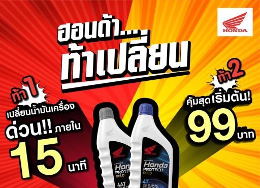 รถจักรยานยนต์ฮอนด้า ตอบรับไลฟ์สไตล์ของคนรุ่นใหม่ที่เต็มไปด้วยความเร่งรีบ พร้อมกับตอกย้ำความเชื่อมั่นด้านบริการหลังการขายให้กับลูกค้าทั่วประเทศ ด้วยการเปิดตัวแคมเปญใหม่ล่าสุด “ฮอนด้าท้าเปลี่ยน” มอบบริการเปลี่ยนถ่ายน้ำมันเครื่องแบบเร่งด่วน ในราคาเบาๆ แต่ได้มาตรฐานการบริการจากศูนย์ฮอนด้าแท้ๆ แคมเปญ “ฮอนด้าท้าเปลี่ยน” มอบบริการเปลี่ยนน้ำมันเครื่องด่วนพิเศษภายใน 15 นาที ด้วยราคาเริ่มต้นเพียง 99 บาท (Honda Protech Gold...
